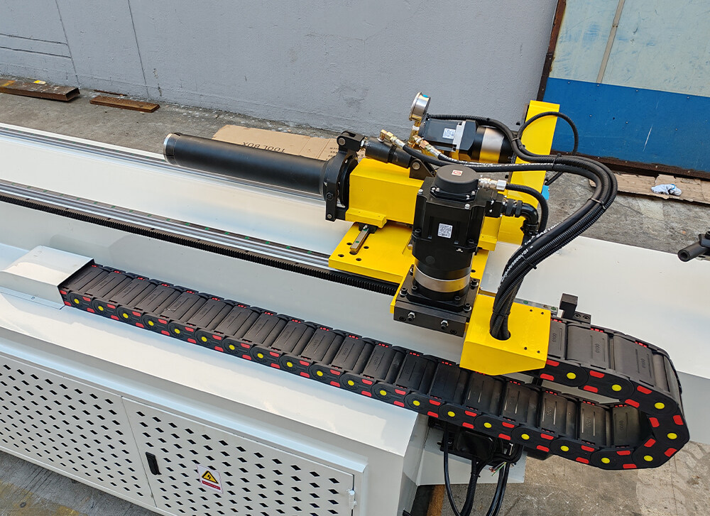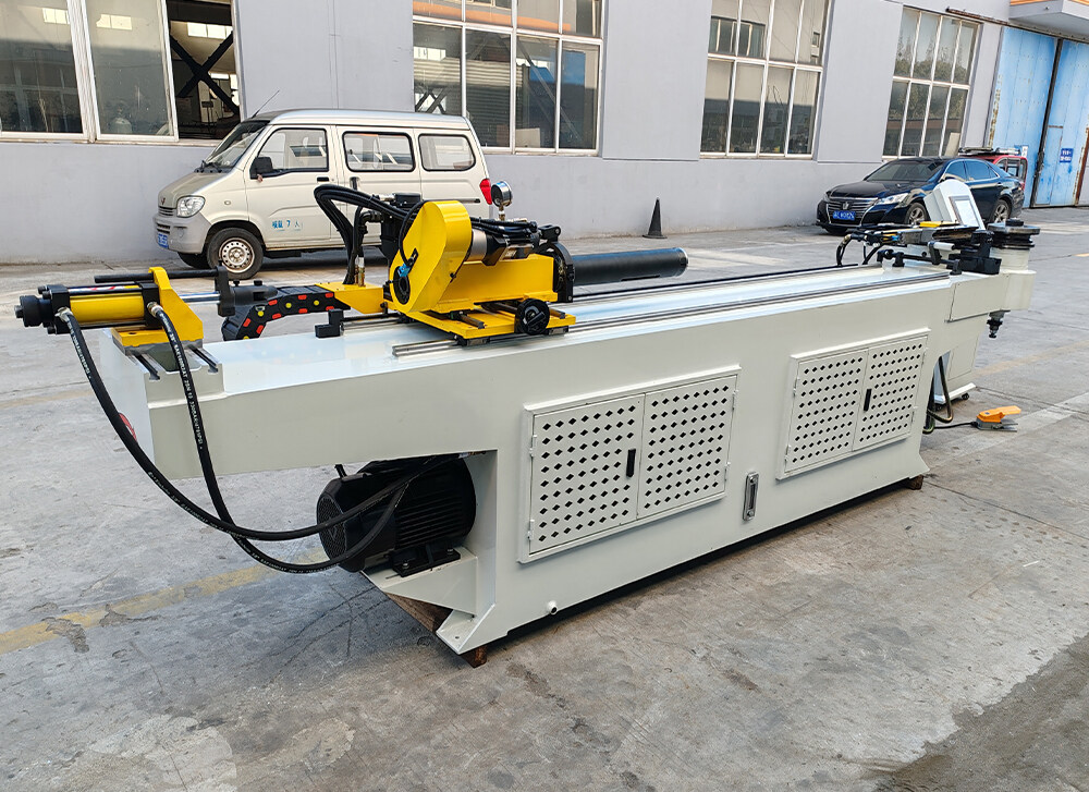 全自动弯管机DW50CNC-2A-1S详细介绍:一、触摸屏显示,数控电脑操作,可储存500组记忆二、反弹补偿值设定程序,程序及加工资料保密功能三、转角、送料为伺服控制. 弯管为油缸控制四、操作系统配有口令、钥匙,以及数量和用时记录,便于生产管理五、具有慢弯、慢抽芯功能六、错误信息在荧幕上显示,帮助操作者立即清除